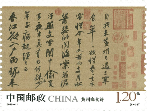 行书产生于汉代,发展成熟于魏晋,是介于草书和楷书之间的一种书体。其特点是简化了楷书笔画,改变了楷书笔形,草化了楷书结构,但较之草书和楷书更适合日常应用。《兰亭序》,纸本,行书,东晋王羲之书,北京故宫博物院藏。此帖是王羲之与友人在会稽山阴(今浙江绍兴)兰亭举行“修禊”之典时所作诗序。其书法用笔道丽爽健,结体潇洒秀美,风格飘逸灵动 ,体现了王羲之所创造的新书体风貌,对后世影响深远。《黄州寒食诗》,纸本,行书,北宋苏轼书,台北故宫博物院藏。此系两首五言诗,为作者贬居黄州后生活困顿、心境悲凉的真实写照。此帖笔意自然,用笔以侧锋为主,点画肥重,体势宽博,圆劲而有韵味,代表了苏轼行书的最高成就。《祭侄文稿》,麻纸本,行草,唐代颜真卿书,台北故宫博物院藏。此稿是颜 真卿为祭奠在“安史之乱”中殉难的侄子季明而作。书家用笔果断自然,大量使用渴笔、枯墨,体现内心哀痛之情,笔势飞动,姿态横生,达到了流露真情、撼人心魄的艺术效果。