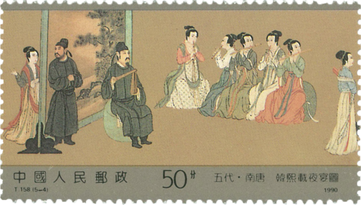 《韩熙载夜宴图》是五代南唐大画家顾闳中的作品。相传南唐李后主曾想重用他的大臣韩熙载,但听说韩“多为声妓,专为夜饮”,生活放荡不羁,便派顾闳中前去宅中窥视。《韩熙载夜宴图》是画家亲临宴会所见情景的艺术再现。这幅画卷用传统的连续故事表现手法,以情节的进展分段,段与段之间又巧妙的相互联系,记叙了夜宴的全过程。邮票采用连票形式印制,使整个画面完整连贯一体。