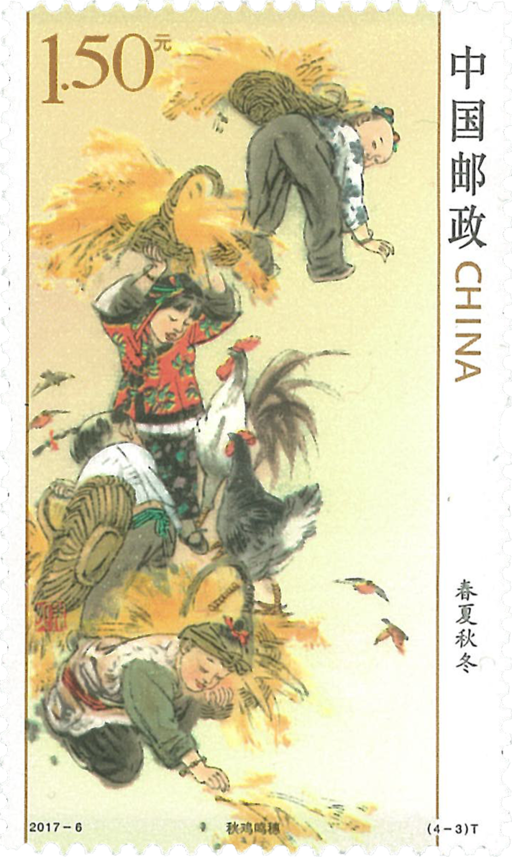 地球在围绕太阳不停地公转的同时,也在绕自身的地轴自转,不过地轴并不垂直于公转轨道面,而是有一个66.5度的倾角。正因为这个倾角的存在,才会使太阳在地球表面的直射点在南、北回归线之间移动,从而形成了春夏秋冬,又称为“四季”。春天始于二十四节气中的“立春”,夏天始于“立夏”,秋天始于“立秋”,冬天则始于“立冬”。四季的概念在黄河流域最为确切,我国劳动人民总结的基本规律是春生、夏长、秋收、冬藏。正是《黄帝内经》等国学典籍所阐述的人与自然关系的基本思想。春夏秋冬四季在中国人眼里不仅是季节的分界,更是人与自然的和谐相处。邮票内容分别为:春燕剪柳、夏荷戏水、秋鸡鸣穗、冬雪映梅。“春”来微风和煦、两岸柳扬,一群幼童在放风筝;“夏”时孩子们摇着小船穿梭在荷花荡,有的顶着荷叶帽,有的摆弄着手中莲花;“秋”日云高万里,遍布金黄色调。孩童们忙着收稻谷;“冬”有飘漫天、梅红绽放,女儿家在忙着贴福字、孩童们蹲在地上放鞭炮,给新年讨个好彩头,一派喜气祥和的景象。