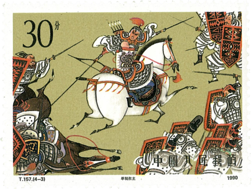 [单骑救主]取自《三国演义》第四十一回“刘玄德携民渡江赵子龙单骑救主”。火烧新野之后,刘备携百姓渡江,行动迟缓,在当阳县被曹军追上。一场厮杀,越子龙不见刘备一家老小,便入乱军之中拼杀。他截获了曹操的“青釭”宝剑,杀曹军如砍瓜切菜。糜夫人身负重伤怕拖累赵子龙,投井而死,甘夫人被救至长坂桥。赵子龙怀抱阿斗突出重围。刘备从血满征衣的赵子龙手中接过正在酣睡的阿斗扔在地上言:“为你这个乳臭未干的孩子,几科折损我一员大将。”