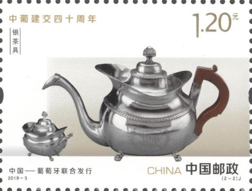 此次中葡联合发行邮票展现了具有两国特色的茶具。邮票第一图选取中国的紫砂茶具,画面以紫砂壶为主体,一旁为紫砂茶杯。以紫砂壶为代表的紫砂茶具是江苏宜兴特有的陶土工艺品。邮票上的紫砂壶器型优美,以南瓜型的壶体和瓜藤型的提梁而富有自然情趣,现藏于宜兴市阳羡紫砂陶博物馆,其制作者是第一批国家级非物质文化遗产“宜兴紫砂制作技艺”代表性传承人汪寅仙。邮票第二图选取葡萄牙的银茶具,画面以银茶壶为主体,一旁为银质糖罐。邮票上的银茶壶器型精美,壶身上有装饰纹样,底部有圆形四足,配木制手柄,于19世纪早期出产于葡萄牙港口城市波尔图,现藏于葡萄牙拉梅古博物馆。