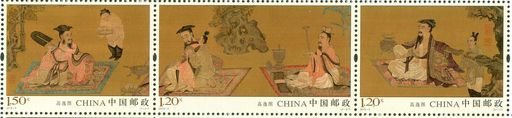 《高逸图》有宋徽宗瘦金体题签“孙位高逸图”,著录于宋徽宗的《宣和画谱》里,画上钤印“宣和七玺”。《高逸图》上的七玺是全的,作品的装裱保留了北宋的形式。递藏宋内府、清梁清标、清内府,现藏上海博物馆。