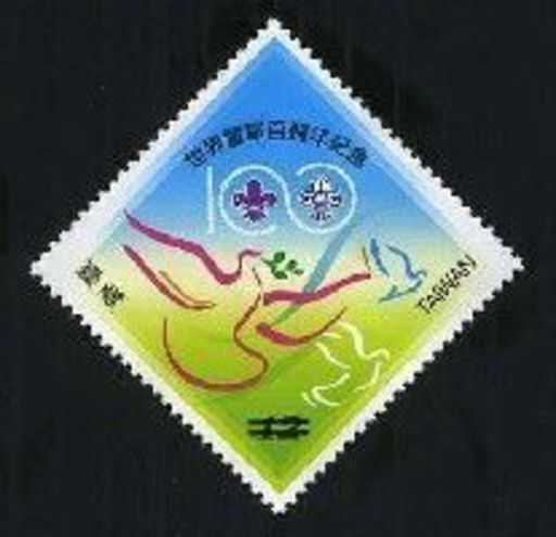 世界童军运动始于1907年,2007年适逢百周年,台湾中华邮政为纪念童军新世纪的到来,特规划发行「世界童军百周年纪念邮票」1枚,面值为新台币12元。本组邮票图案设计系遵循世界童军百周年纪念活动的精神,以同心许诺、世界大同的概念出发;主视觉和平鸽,展现出热情自由及爱好和平的意象。童军绳围成100周年字样,并圈起世界童军组织与我国童军的标志,象征台湾与世界同步的紧密连结。图案色彩采天然的蓝、绿色系,传达童军的环保精神,更彰显童军与大自然共存的生态情怀,传达出童军百周年的新形象。为增添邮票的收藏价值及趣味性,本组邮票特别设计为正菱形。