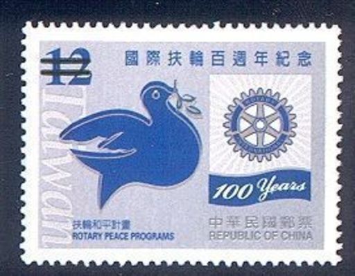 国际扶轮创始于1905年,2005年适届满100周年,为彰显国际扶轮长期对社会的贡献,台湾中华邮政特印制「国际扶轮百周年纪念邮票」1组2枚。面值5元图案以台湾地图与国际扶轮百周年LOGO并列,象征扶轮精神在台湾;面值12元图案将和平鸽图形与国际扶轮百周年LOGO并列,表现扶轮传达世界和平的努力。