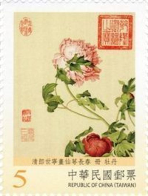 郎世宁为义大利人,1715年来华传教,以绘事供奉内廷,画法参酌中西,擅长花鸟题材。「清郎世宁仙萼长春册」绢画16开,分绘四时花卉,色彩鲜艳夺目,景物布置细巧,且宾主呼应得宜,可谓兼融中西画法之难得杰作。上辑邮票1组8枚,图案分别为「清郎世宁画仙萼长春册牡丹(面值5元)、桃花(面值5元)、芍药(面值7元)、海棠玉兰(面值9元)、虞美人蝴蝶花(面值10元)、黄刺蘼鱼儿牡丹(面值10元)、石竹(面值12元)、樱桃桑鸤(面值12元)」,设色精致,构图手法亦见新意。