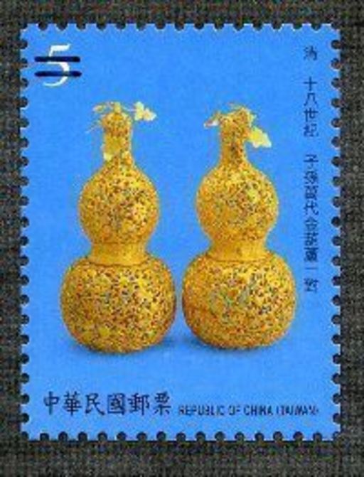 一、清十八世纪子孙万代金葫芦一对(面值5元):器身葫芦形,器壁镂雕缠绕的花叶及小葫芦。上端瓜蒂旁立雕卷藤及小叶3片,器身中腰处似子母口般上下套接。大者称瓜,小者为瓞,葫芦瓜蔓末端不断开花结实。以「绵绵瓜瓞」比喻子孙繁盛、传世万代。