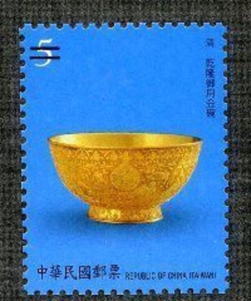 二、清乾隆御用金碗(面值5元):金碗内壁光素,外壁石榴、花、叶纹饰之间,满布繁密之粟形小粒金珠,炫目华丽。碗底圈足内阴刻双钩楷书款:「乾隆御用」四字。