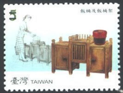一、饭桶及饭桶架(面值5元):台湾早期饭桶大多为木制,其大小可显示家中人丁规模。而饭桶架多以木制、十字枨交叉结构为主;其主要功能为放置饭桶之用,常置于饭桌旁。