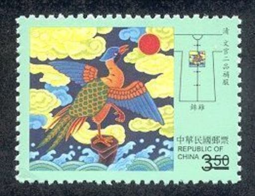 中华民族传统服饰文化独树一帜,文武官服至明朝洪武年间开始奠定制度用以辨别尊卑;至清朝顺治年间更规定1至9品之文武官员以方补缀饰。明清官服之补子对于绣工技巧与织绣材料极为讲究,深具艺术价值。为使国人进一步了解章服文化,台湾中华邮政特以清朝文官1至4品之补服为主题,印制「中华传统服饰邮票-清文官补服」1组4枚。