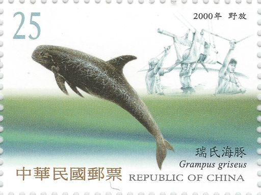 (4)瑞氏海豚:台湾东部海岸最常见的海豚。灰黑色的身上有许多同伴牙齿造成的刮痕或鱿鱼触手吸盘在嘴边造成的圆形印痕。随着年龄增长,身上花纹越多,尤其头部常因花纹太多而几近白头。成体体重300至500公斤。2000年7月于苗栗通霄搁浅之瑞氏海豚「阿通伯」,经64天复健后,野放回大海,缔造了亚太地区首度成功复健并野放鲸豚的纪录。