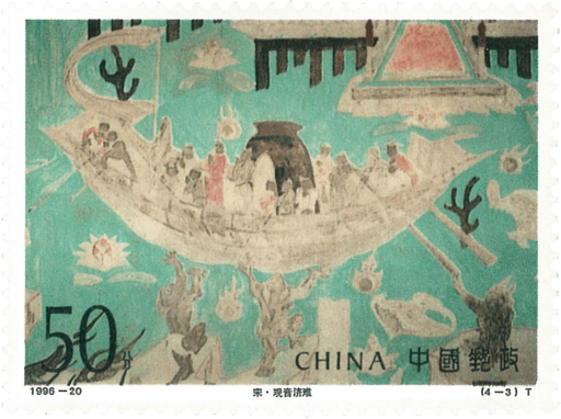 这是《敦煌壁画》系列邮票的最后一组,内容为唐代以后的敦煌壁画。唐代以后,敦煌石窟历经五代、北宋、西夏、元等时代的发展、演变呈现出不同的面貌,出现不少新的壁画题材。第55窟的宋代“观音济难”(局部),描绘一只船在水中遇难,船上人念观音名号,观音显形救助;其艺术形象更加贴近现实。