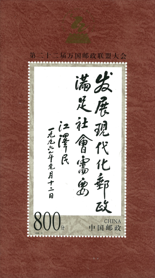 1874年9月15日,22个国家代表在瑞士伯尔尼召开了邮政总联盟第一次会议,为第一届万国邮政联盟大会。1999年在中国北京召开的为第二十二届万国邮政联盟大会。会员国已达189个。本届大会名誉主席江泽民为大会题词:“发展现代化邮政,满足社会需要。”两枚邮票的主图分别为第一届邮联大会会址一当时的瑞士联邦议会大厦和第二十二届邮联大会会址一北京国际会议中心。小型张图案为江泽民主席题词手迹。
