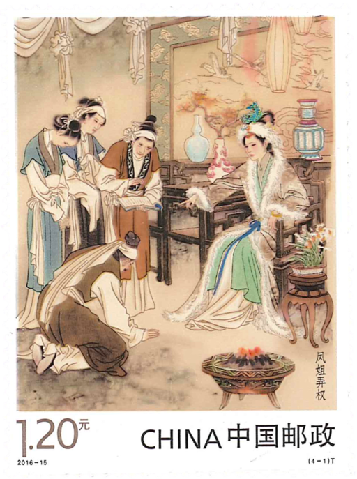 <红楼梦>原名<石头记>,章回体长篇小说。作品以贾、史、王、薛四大家族为背景,以贾宝玉、林黛玉的爱情悲剧为主要线索,描写了贾家荣、宁二府由盛而衰的过程。内容广泛、涉及各个学科,如诗词歌赋、琴棋书画、建筑亭阁、舟车行轿、服饰妆容、婚丧祭祀、饮食药膳、茶酒文化以及佛教、道教、儒家思想等传统文化,几乎无所不包。<红楼梦>语言优美生动,善于刻画人物,塑造了许多富有典型性格的艺术形象,具有卓越的艺术成就 。凤姐弄权取自原著第十四回《林如海捐馆扬州城贾宝玉路谒北静王》画面中王熙凤端坐;面部带愠,手指跪地上的小厮。旁边的丫鬟和妇人皆俯首听命。将王熙凤的精明能干表现得淋漓尽致。龄官画蔷取自第三十回《宝钗借扇机带双敲龄官划蔷痴及局外》。画面中一位少女蹲在蔷薇花架旁,手持金簪,地上画了很多“蔷”字,宝玉躲在花架后,偷偷看着龄官。睛雯撕扇取自第三十一回《撕扇子作千金一笑因麒麟伏白首双星》。画面中睛雯脸带俏皮微笑,手持一把被撕碎的扇子,宝玉在旁边拍手叫好。刻画了睛雯天真幼稚,张扬率性的性格特征。宝玉受笞取自第三十三回《手足耽耽小动唇舌不肖种种大承笞挞》。画面中贾政跌坐在一旁,王夫人扶着宝玉,宝玉躺在地上,旁边的袭人、李纨、三春姐妹等人陪在身旁落泪。贾母手执拐杖,满脸关切和心疼。小型张归省庆元宵取自第十八回《大观园试才题对额荣国府归省庆元宵》。画面表现元春归来省亲庆元宵时,贾府的华贵和气派。左边为宫里服侍的宫女,贾母陪在衣着雍容华贵的元春旁边,母亲王夫人一边拭泪 一边陪着女儿。右边站着邢夫人、王熙凤、三春姐妹等人。