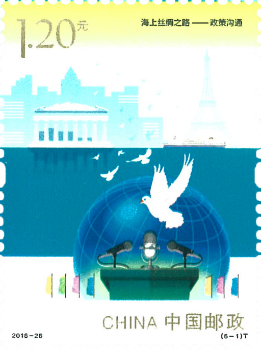 海上丝绸之路是指中国与世界其他地区进行经济文化交流、交往的海上通道。在唐、宋、元的繁盛期,中国境内主要由泉州、广州、宁波三个主港和其他支线港组成,为联合国教科文组织唯一认定的海上丝绸之路起点。丝绸之路不是具体的一条路,而是后世对中国与西亚、中亚、西方所有来往通道的统称。在唐中期前,对外主通道是陆上丝绸之路,之后由于战乱及经济重心转移等原因,海上丝绸之路取代了陆路成为中外贸易交流主通道,在宋元时期是范围覆盖大半个地球的人类历史活动和东西方文化经济交流的重要载体。2013年9月和10月,中国国家主席习近平在出访中亚和东南亚国家期间,先后提出共建“丝绸之路经济带”和“21世纪海上丝绸之路”的重大倡议。这一构思以“政策沟通、设施联通、贸易畅通、资金融通、民心相通、海上交通”为主要内容,为沿线各国经济社会共同发展创造更加美好的明天。“21世纪海上丝绸之路”建设不仅延续古代海上丝绸之路曾经繁荣的海上合作,还赋予其新的时代内涵,使之成为促进共同发展、实现共同繁荣的合作共赢之路,增进理解信任、加强全方位交流的和平友谊之路。邮票背景将海上丝绸之路沿线的知名历史古迹与现代地标建筑及示意性的城市建筑群相结合,由古至今,反映出海上丝绸之路的地理范围和其绵延不绝的悠久历史与欣欣向荣的时代风貌。