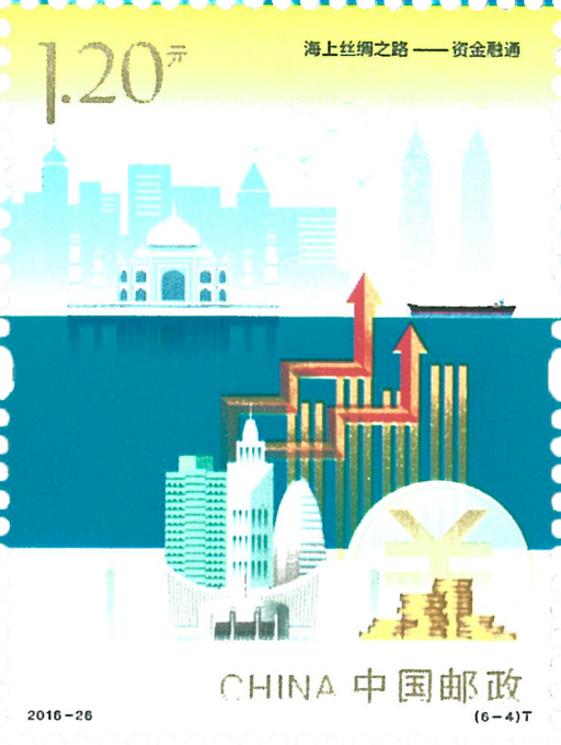海上丝绸之路是指中国与世界其他地区进行经济文化交流、交往的海上通道。在唐、宋、元的繁盛期,中国境内主要由泉州、广州、宁波三个主港和其他支线港组成,为联合国教科文组织唯一认定的海上丝绸之路起点。丝绸之路不是具体的一条路,而是后世对中国与西亚、中亚、西方所有来往通道的统称。在唐中期前,对外主通道是陆上丝绸之路,之后由于战乱及经济重心转移等原因,海上丝绸之路取代了陆路成为中外贸易交流主通道,在宋元时期是范围覆盖大半个地球的人类历史活动和东西方文化经济交流的重要载体。2013年9月和10月,中国国家主席习近平在出访中亚和东南亚国家期间,先后提出共建“丝绸之路经济带”和“21世纪海上丝绸之路”的重大倡议。这一构思以“政策沟通、设施联通、贸易畅通、资金融通、民心相通、海上交通”为主要内容,为沿线各国经济社会共同发展创造更加美好的明天。“21世纪海上丝绸之路”建设不仅延续古代海上丝绸之路曾经繁荣的海上合作,还赋予其新的时代内涵,使之成为促进共同发展、实现共同繁荣的合作共赢之路,增进理解信任、加强全方位交流的和平友谊之路。邮票背景将海上丝绸之路沿线的知名历史古迹与现代地标建筑及示意性的城市建筑群相结合,由古至今,反映出海上丝绸之路的地理范围和其绵延不绝的悠久历史与欣欣向荣的时代风貌。