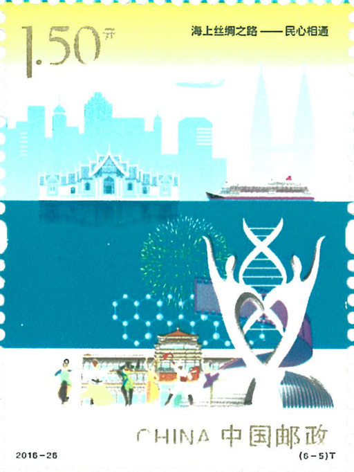 海上丝绸之路是指中国与世界其他地区进行经济文化交流、交往的海上通道。在唐、宋、元的繁盛期,中国境内主要由泉州、广州、宁波三个主港和其他支线港组成,为联合国教科文组织唯一认定的海上丝绸之路起点。丝绸之路不是具体的一条路,而是后世对中国与西亚、中亚、西方所有来往通道的统称。在唐中期前,对外主通道是陆上丝绸之路,之后由于战乱及经济重心转移等原因,海上丝绸之路取代了陆路成为中外贸易交流主通道,在宋元时期是范围覆盖大半个地球的人类历史活动和东西方文化经济交流的重要载体。2013年9月和10月,中国国家主席习近平在出访中亚和东南亚国家期间,先后提出共建“丝绸之路经济带”和“21世纪海上丝绸之路”的重大倡议。这一构思以“政策沟通、设施联通、贸易畅通、资金融通、民心相通、海上交通”为主要内容,为沿线各国经济社会共同发展创造更加美好的明天。“21世纪海上丝绸之路”建设不仅延续古代海上丝绸之路曾经繁荣的海上合作,还赋予其新的时代内涵,使之成为促进共同发展、实现共同繁荣的合作共赢之路,增进理解信任、加强全方位交流的和平友谊之路。邮票背景将海上丝绸之路沿线的知名历史古迹与现代地标建筑及示意性的城市建筑群相结合,由古至今,反映出海上丝绸之路的地理范围和其绵延不绝的悠久历史与欣欣向荣的时代风貌。
